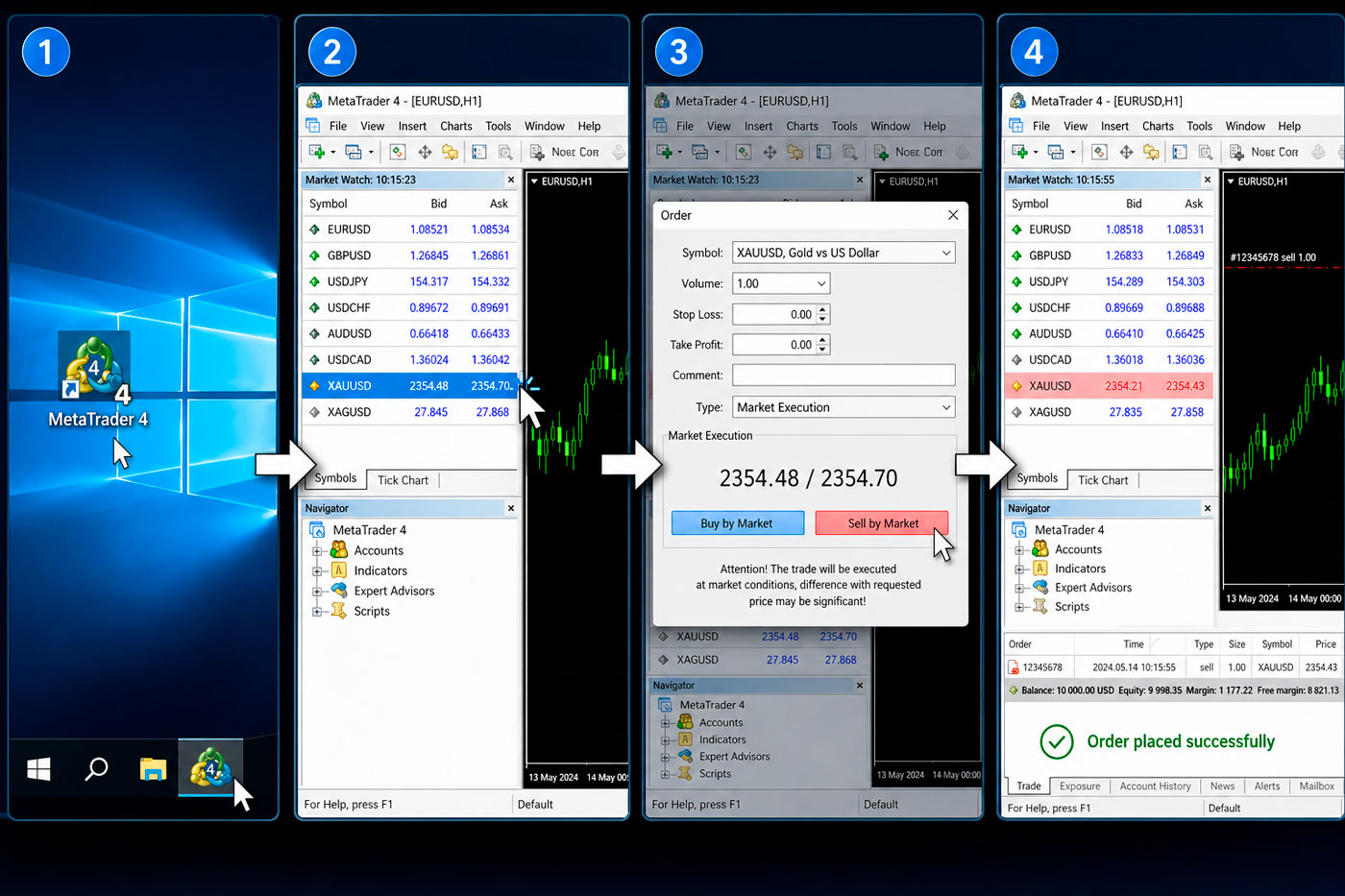Сначала вы продаёте актив, например XAUUSD, по текущей биржевой цене, а после падения стоимости закрываете свою сделку покупкой. Подробно о торговле золотом.